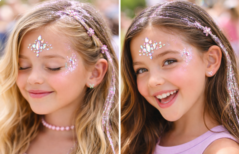 Face gems, glitter tattoos, and non-toxic makeup to complete the glow-up.🎨 DIY Creativity